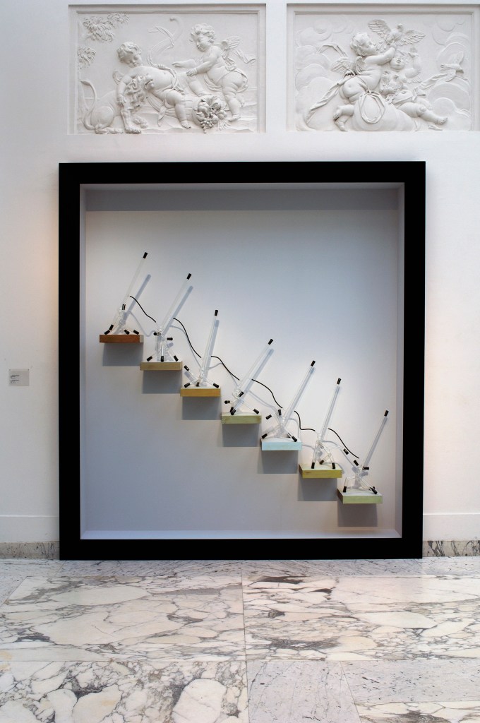 MATERIALS glass, lacquered wooden frame, wooden boxes, rubber stoppers and tubing, paint